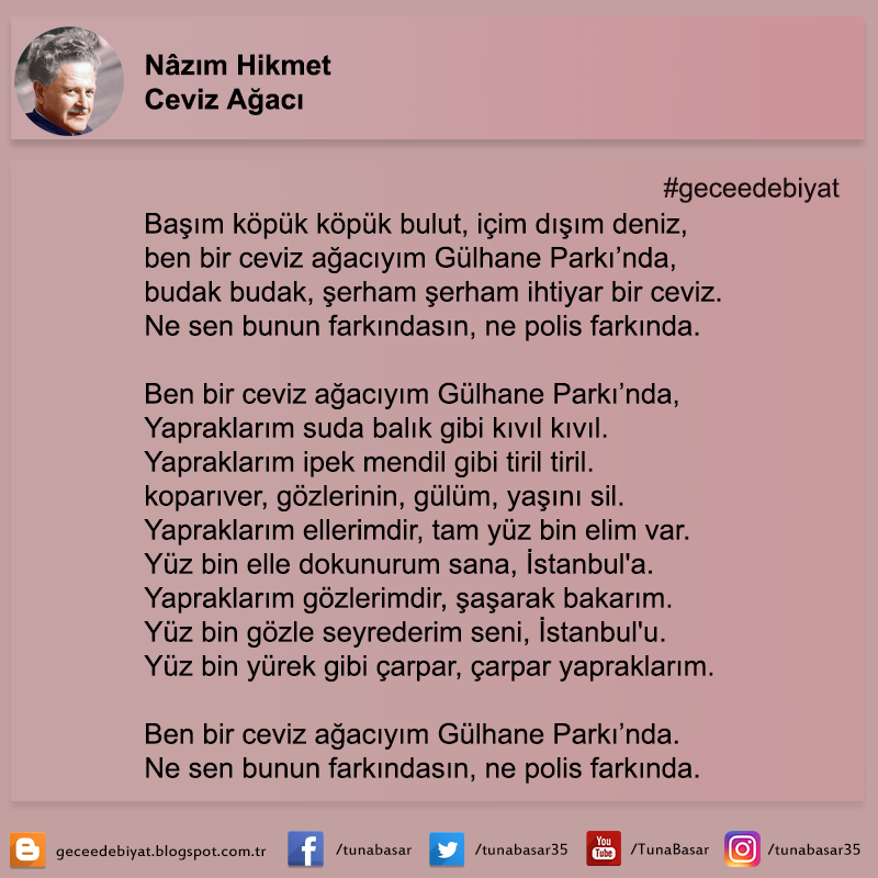 Bize gülhane deki heybetli ceviz ağacını köpük köpük bulutlarla ve polis kovalamacasıyla anlatan bu şiiri çok kere dinlemişizdir.