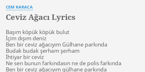 Cem karaca ceviz ağacı şarkı sözleri. Başım köpük köpük bulut içim dışım deniz ben bir ceviz ağacıyım gülhane parkı nda budak budak serham serham ihtiyar bir ceviz ne sen bunun. Başım köpük köpük bulut içim dışım deniz ben bir ceviz ağacıyım gülhane parkı nda budak budak serham serham ihtiyar bir ceviz ne sen bunun farkındasın.