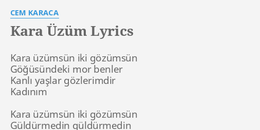 Kara üzümsün iki gözümsün. Kara üzüm kara üzümsün iki gözümsün göğüsündeki mor benler kanlı yaşlar gözlerimdir kadınım. Cem karaca kara üzüm şarkısını şarkı sözü ile birlikte dinle. Cem karaca kara üzüm cem karaca dinle cem karaca şarkıları mix full naz müzik cd yi satın al https goo gl cyombj apple müzik de dinle https goo gl bo8x9r spotify https goo.