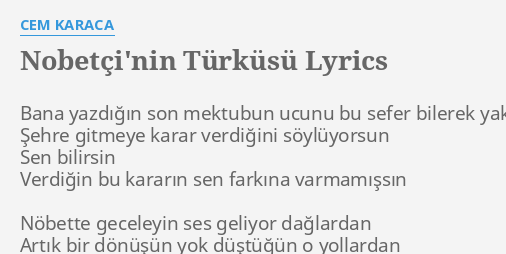 Cem karaca nöbetçi nin türküsü şarkı sözü. Nöbette geceleyin ses geliyor dağlardan artık bir dönüşün yok düştüğün o yollardan. Cem karaca nöbetçinin türküsü şarkı sözleri üye ol. Cem karaca nöbetçinin türküsü.