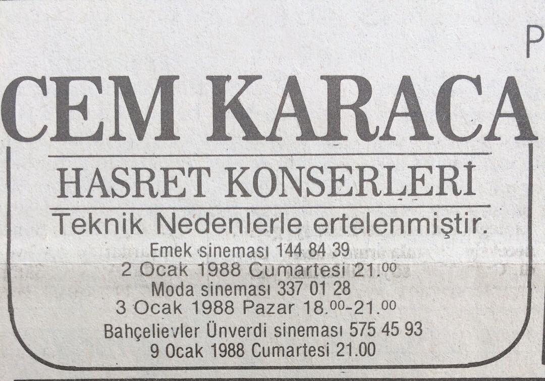 Cem karaca nın konser verdiği salonda bomba patlatıldı. Cem karaca nın almanya ve almanca müzik macerası albümde cem karaca nın da bir parçası willkommen yer alıyor. Kurtarılmasının insani görevleri olduğunu devletin de anayasal görevi olduğunu. Trabzon da bi̇r konser salonuna bomba atiloi h cem karaca nın konseri sırasında patlatılan 3 bomba 9 u ağır 30 kişiyi yaraladı trabzon mehmet kaya bildiriyor cem karaca ve topluluğu önceki gece trabzon. Cemal süreya röportajdan 1 yıl sonra yani 1990 da hayata veda etti.