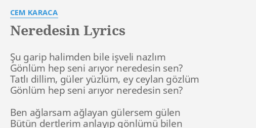 Hasan ı vurdular fatma hasan ı buldu. Cem karaca nerdesin cem karaca dinle cem karaca şarkıları mix full naz müzik cd yi satın al https goo gl pvwe2w apple müzik de dinle https goo. Cem karaca neredesin sen cem karaca şarkıları neşet ertaş naz müzik cd yi satın al https goo gl cyombj apple müzik de dinle https goo gl bo8x9r spotify https goo gl g5dwfb deezer https goo gl phk6zp neredesin sen söz su garip halimden bilen şiveli nazli gonlum hep seni ariyor neredesin sen. Nerdesin akşam oldu kara gözlüm nerdesin i̇htiyarlık bu canıma yoksulluk ocağıma kar yağdı ömrüm bağına nerdesin nazlı yarim nerdesin nerdesin.