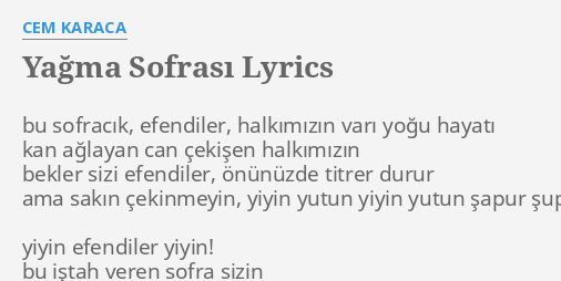 Kan ağlayan can çekişen halkımızın. Doyuncaya tıksırıncaya patlayıncaya. Cem karaca isimli sanatçının seslendirdiği yiyin efendiler yağma sofrası ne ait sadece şarkı sözü bulunmaktadır sitemizde hiç bir şekilde yiyin efendiler yağma sofrası ne ait başka bir içerik bulunmamaktadır eğer şarkı sözünün sitemizden kaldırılmasına dair bir isteğiniz var ise iletişim sayfası üzerinden iletişime geçebilirsiniz. Cem karaca yiyin efendiler yağma sofrası letra e música para ouvir bu sofracık efendiler halkımızın varı yoğu hayatı kan ağlayan can çekişen halkımızın bekler sizi efendiler önümüzde titrer durur ama.