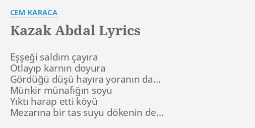Nutk eylemek cem karacanın yorumu çok hoştur. Müfsidin bir de gammazın mali vardır da yemezin abdestsiz namaz kılanın da. Cem karaca eşeği saldım çayıra şarkısını şarkı sözü ile birlikte dinle. Kazak abdalın en bilinen şiiridir.